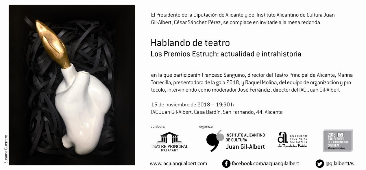 El IAC Juan Gil-Albert organiza una mesa redonda titulada “Los Premios Estruch: actualidad e intrahistoria” como acto paralelo a la exposición que sobre el director teatral permanece en la Casa Bardín hasta el 19 de noviembre. Con la participación de Francisco Sanguino, director del Teatro Principal, Marina Torrecilla, presentadora de la última gala de entrega, y Raquel Molina, del equipo de protocolo, el coloquio –programado a las 19:30 h– reflexionará sobre lo que representan culturalmente estos premios, interviniendo como moderador el director del IAC, José Ferrándiz Lozano.