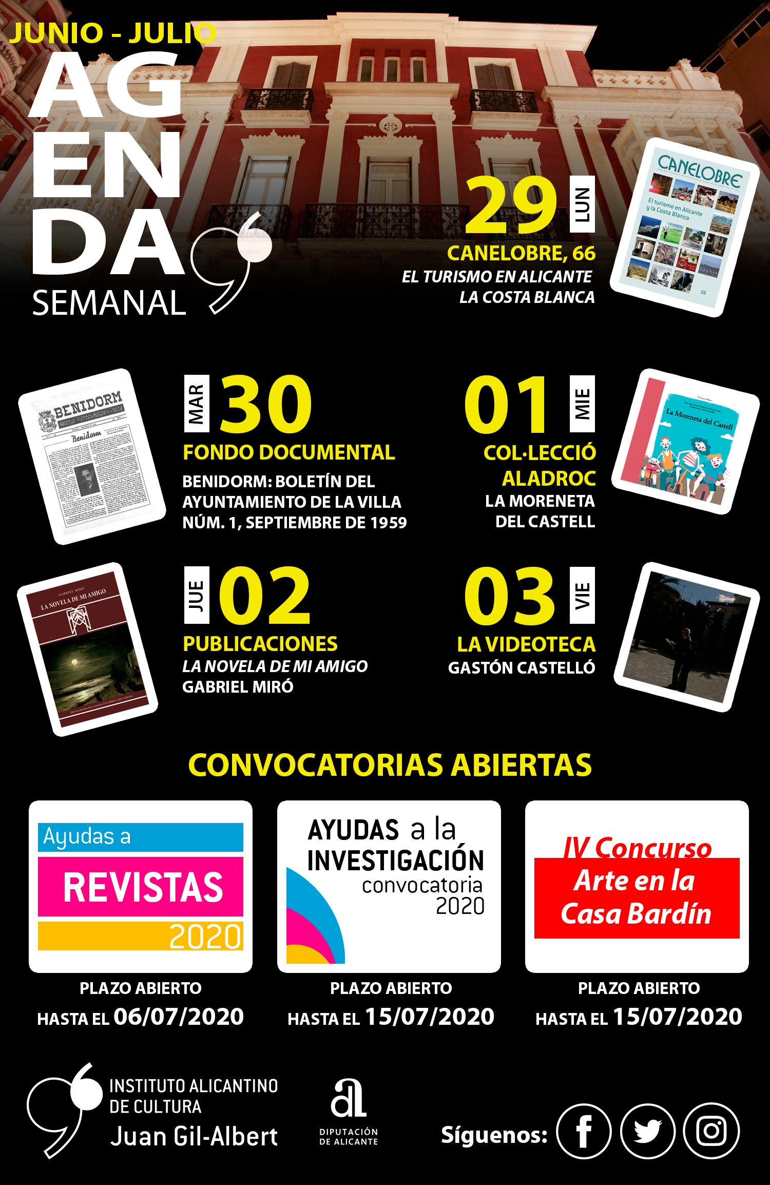 Ayudas a Revistas: el objetivo de estas ayudas es apoyar la difusión cultural realizada por Entidades culturales sin ánimo de lucro, que publiquen, en la provincia de Alicante y fuera del ámbito universitario, revistas impresas de investigación de probado interés dentro de los campos de las humanidades y las ciencias sociales, que contribuyan al enriquecimiento del patrimonio bibliográfico alicantino, escritas en castellano y/o valenciano, lenguas cooficiales de la Comunidad Valenciana ya sean de contenido provincial, comarcal o local.