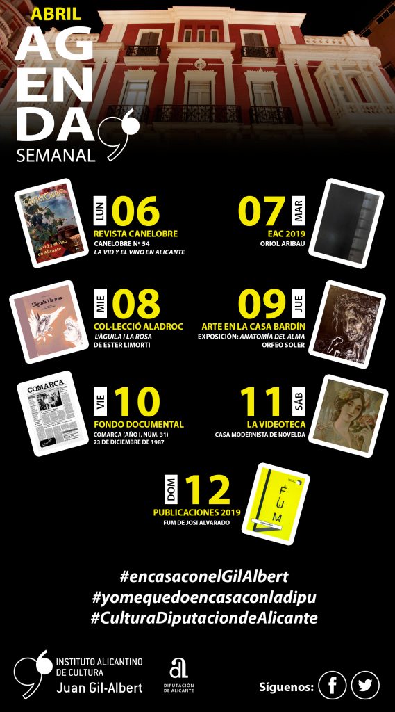 El lunes 6 de abril, el Instituto Alicantino de Cultura Juan Gil-Albert ofrecerá el número 54 completo de la revista Canelobre titulado La vid y el vino en Alicante y coordinado por el enólogo y escritor, Rafael Poveda. Se trata de un estudio que recoge los análisis y artículos elaborados en torno esta producción que forma parte de una actividad económica con un largo recorrido en nuestra historia, cultura y tradiciones. El usuario podrá descargar el PDF desde el enlace que dispondrá en la publicación de Facebook y Twitter