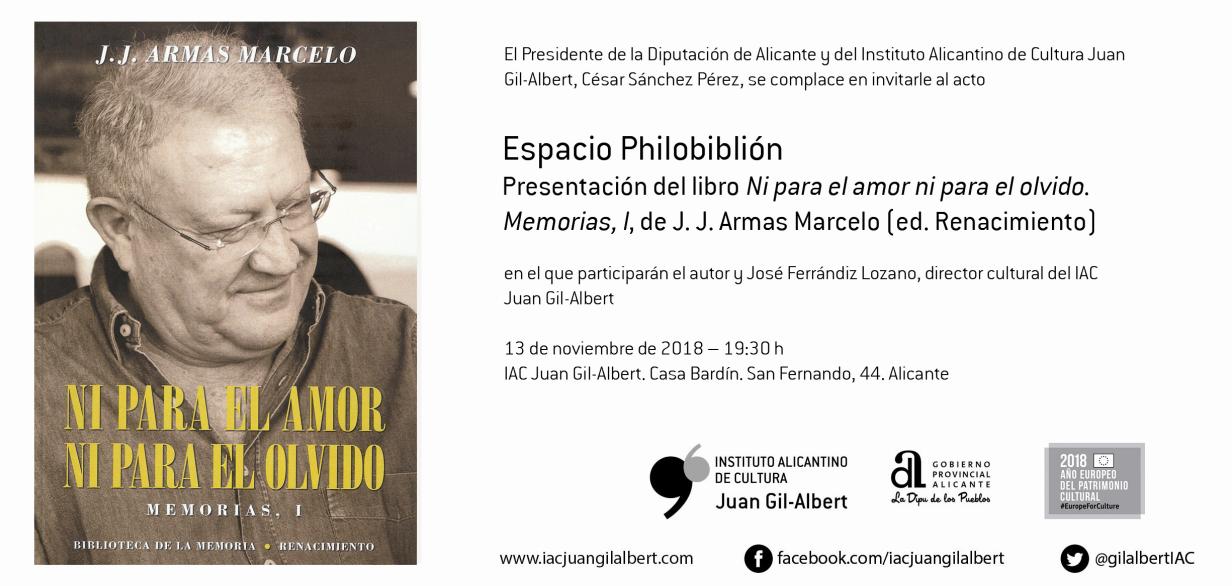 El IAC Juan Gil-Albert acoge la presentación en Alicante del libro Ni para el amor ni para el olvido, primer volumen de memorias del escritor canario J. J. Armas Marcelo, publicado por la editorial Renacimiento. El acto tendrá lugar en la Casa Bardín el martes 13 de noviembre a las 19:30 h, y contará con la participación del autor y de José Ferrándiz Lozano.
