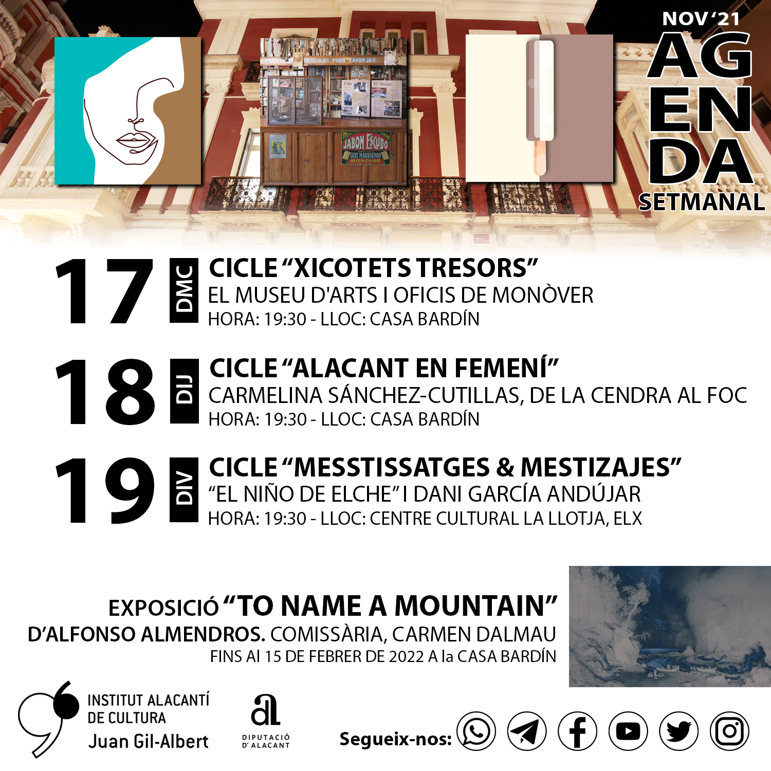 El ciclo “Alicante en femenino. Mujeres de ayer y de hoy”, nace con el objetivo de dar a conocer a mujeres de nuestra provincia que destacan o han destacado en distintos ámbitos de la cultura como el arte, la literatura, la ciencia, el deporte, la política o la gastronomía, entre otros, con el fin de poner en valor sus figuras y reivindicar el papel fundamental de la mujer en nuestra sociedad.