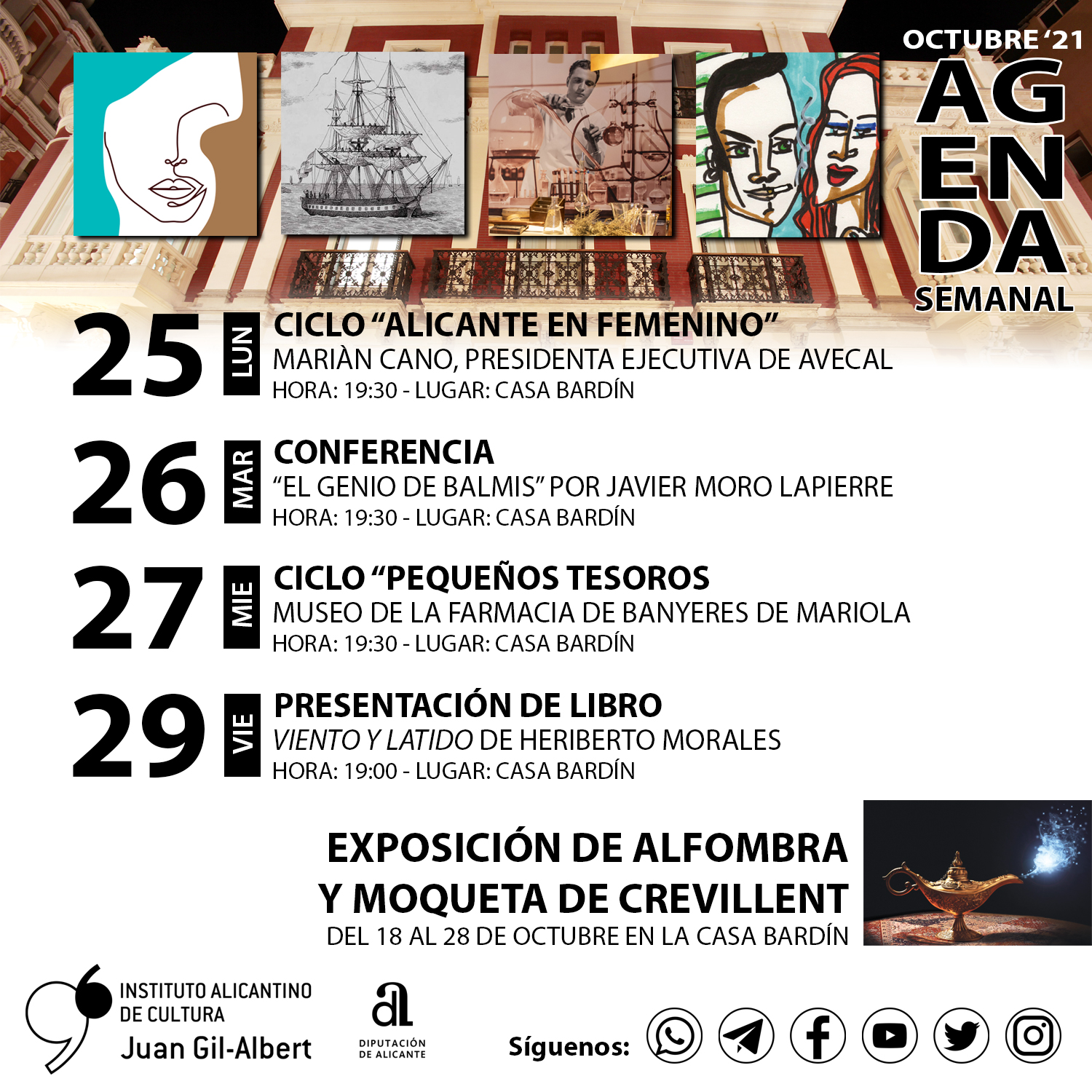 El ciclo “Alicante en femenino. Mujeres de ayer y de hoy”, nace con el objetivo de dar a conocer a mujeres de nuestra provincia que destacan o han destacado en distintos ámbitos de la cultura como el arte, la literatura, la ciencia, el deporte, la política o la gastronomía, entre otros, con el fin de poner en valor sus figuras y reivindicar el papel fundamental de la mujer en nuestra sociedad.
