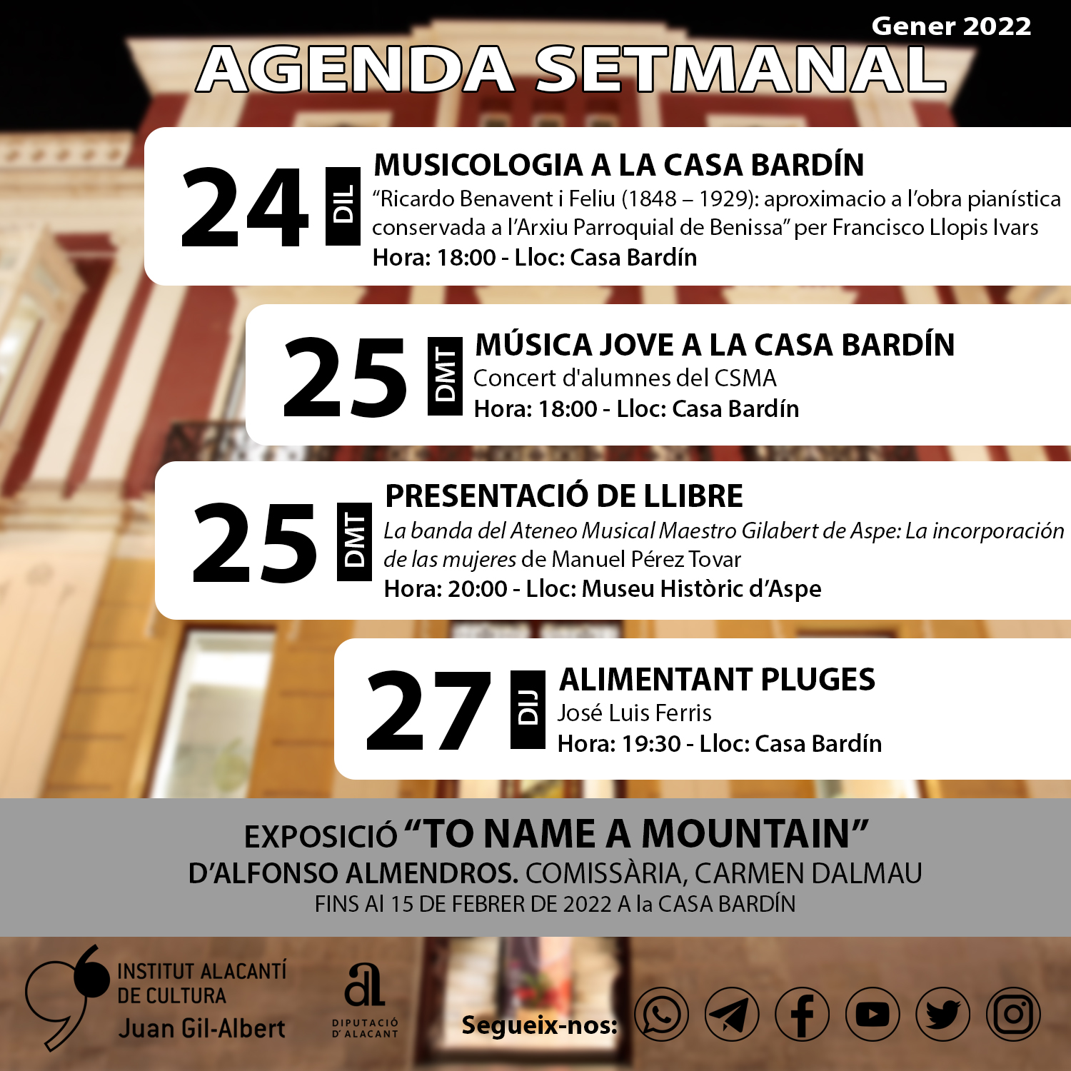 Lunes 24 de enero, a las 18:00 h en la Casa Bardín – Ciclo “Musicología en la Casa Bardín” Conferencia: “Ricardo Benavent i Feliu (1848 – 1929): aproximació a l’obra pianística conservada a l’Arxiu Parroquial de Benissa” por Francisco Llopis Ivars. Con el mismo propósito que inspira el ciclo “Música joven en la Casa Bardín” de dar protagonismo a la juventud en el campo de la música, se da continuidad a este ciclo en el que participan estudiantes y/o exalumnos del Conservatorio Superior de Música Óscar Esplá de Alicante del departamento de Musicología. Se desea con esta iniciativa que dispongan de un espacio público, con asistencia abierta, donde puedan exponer sus hallazgos y conclusiones como actividad añadida y mejora de su formación académica, además de servir de estímulo en su proyección cultural. La actividad consiste en la pronunciación de una conferencia en cada sesión, bajo coordinación de profesorado del propio Conservatorio. Martes 25 de enero, a las 18:00 h en la Casa Bardín – Ciclo “Música Joven en la Casa Bardín” Audición: “Música de Cámara” con el Conservatorio Superior de Música Óscar Esplá de Alicante. Duración aproximada: 65-75 minutos Consultar programa en la página web: pre.iacjuangilalbert.com Con el propósito de dar protagonismo a la juventud en el campo de la música clásica y ofrecer un espacio interpretativo en la primera fase de sus carreras musicales, el IAC Juan Gil-Albert organizó por primera vez este ciclo en 2016 para facilitar las actuaciones en público de estudiantes del Conservatorio Superior de Música Óscar Esplá de Alicante. Los resultados, tanto de participación de alumnos a través de la coordinación de distintos departamentos como de asistencia de público, han sido hasta ahora muy positivos en sus seis ediciones. Contenido y organización de las audiciones El Conservatorio Superior realiza, bajo la coordinación de profesores de distintos departamentos, la selección de alumnos que participan en cada sesión, preparando y dirigiendo sus repertorios; convirtiéndose estas audiciones en un complemento práctico a su formación y estudios. En 2022 se mantiene pues la filosofía y estructura de la actividad, consistente en la interpretación de recitales o audiciones de cámara, coincidiendo con periodo lectivo del curso. Con ello la Casa Bardín se convierte en espacio musical, unido en este proyecto con el único Conservatorio Superior de la provincia de Alicante. Martes 25 de enero, a las 20:00 h en el Museo Histórico de Aspe – Presentación del libro del XVI Premio de Investigación Manuel Cremades La Banda del Ateneo Musical Maestro Gilabert de Aspe: La incorporación de las mujeres de Manuel Pérez Tovar. Estudio de la evolución que ha tenido el papel de la mujer en la actividad de la banda del Ateneo Musical Maestro Gilabert de Aspe, desde su incorporación hasta la actualidad. De esta forma se pretende hallar quiénes fueron las primeras mujeres en incorporarse a la actividad de la banda, las circunstancias sociales que promovieron esta incorporación, su evolución y por último observar las diferencias existentes entre el papel que jugaban en un primer momento y el que juegan en la actualidad. Jueves 27 de enero, a las 19:30 h en la Casa Bardín – Ciclo “Alimentando Lluvias” José Luis Ferris “Alimentando lluvias”, palabras tomadas de un verso de Miguel Hernández, es un ciclo poético organizado por el IAC Juan Gil-Albert que se ha realizado en anteriores ediciones –y que se recupera para este 2022- con gran acogida por parte de la comunidad literaria. Se pretende, desde una perspectiva de encuentro y cercanía, poner de relieve el amplio panorama poético del que goza la provincia de Alicante en la actualidad. Desde una visión amplia, el ciclo recogerá una muestra de la creación literaria que se desarrolla en Alicante y todas sus comarcas. El ciclo se inaugurará con la intervención de José Luis Ferris, escritor y poeta, y continuará a lo largo de ocho sesiones de carácter mensual desarrolladas a lo largo de 2022 en los meses de enero, febrero, marzo, abril, mayo, octubre, noviembre y diciembre, se dará voz a autores de diferentes generaciones y estéticas, algunos con largo recorrido y otros que, a pesar de tener menos trayectoria, tienen proyección en el mundo de la poesía. Poetas que escriben en nuestras dos lenguas oficiales y conviven en el mundo de los versos desde diferentes enfoques artísticos, incluso interdisciplinares. Además, el proyecto incluye la presencia de poetas que se mueven dentro del underground alicantino y que tienen un largo bagaje, con la intención de ampliar la perspectiva oficial y acercarnos a la realidad de la ciudadanía. José Luis V. Ferris (Alicante, 1960) Escritor, poeta y ensayista es licenciado en Filología Hispánica por la Universidad de Salamanca y Doctor en Literatura Española por la Universidad de Alicante. Como poeta ha publicado Piélago (1985), Premio de la Crítica de la Comunidad Valenciana 1986, Cetro de cal (1985) accésit del Premio Adonais 1984, Niebla firme (1989) y Poemas del agua y de la noche (2010). Es autor de los relatos infantiles La isla de Tododelrevés (2007), Las palabras del agua (2008), Gacela de amor y nieve (2008), Mi primer libro sobre Miguel Hernández (2010) y Miguel Hernández. Pastor de sueños (2010). Con su primera novela, Bajarás al reino de la tierra, obtuvo el Premio Azorín 1999. En 2000 publica El amor y la nada y en 2010 El sueño de Whitman, Premio Málaga de Novela 2009. Es autor de biografías destacadas: Miguel Hernández. Pasiones, cárcel y muerte de un poeta (2002, 2010), Premio de la Crítica de la Comunidad Valenciana 2003, Maruja Mallo. La gran transgresora del 27 (2004) y Carmen Conde. Vida, pasión y verso de una escritora olvidada (2007). Ha publicado numerosos artículos sobre literatura en varios periódicos y revistas españoles. En la actualida