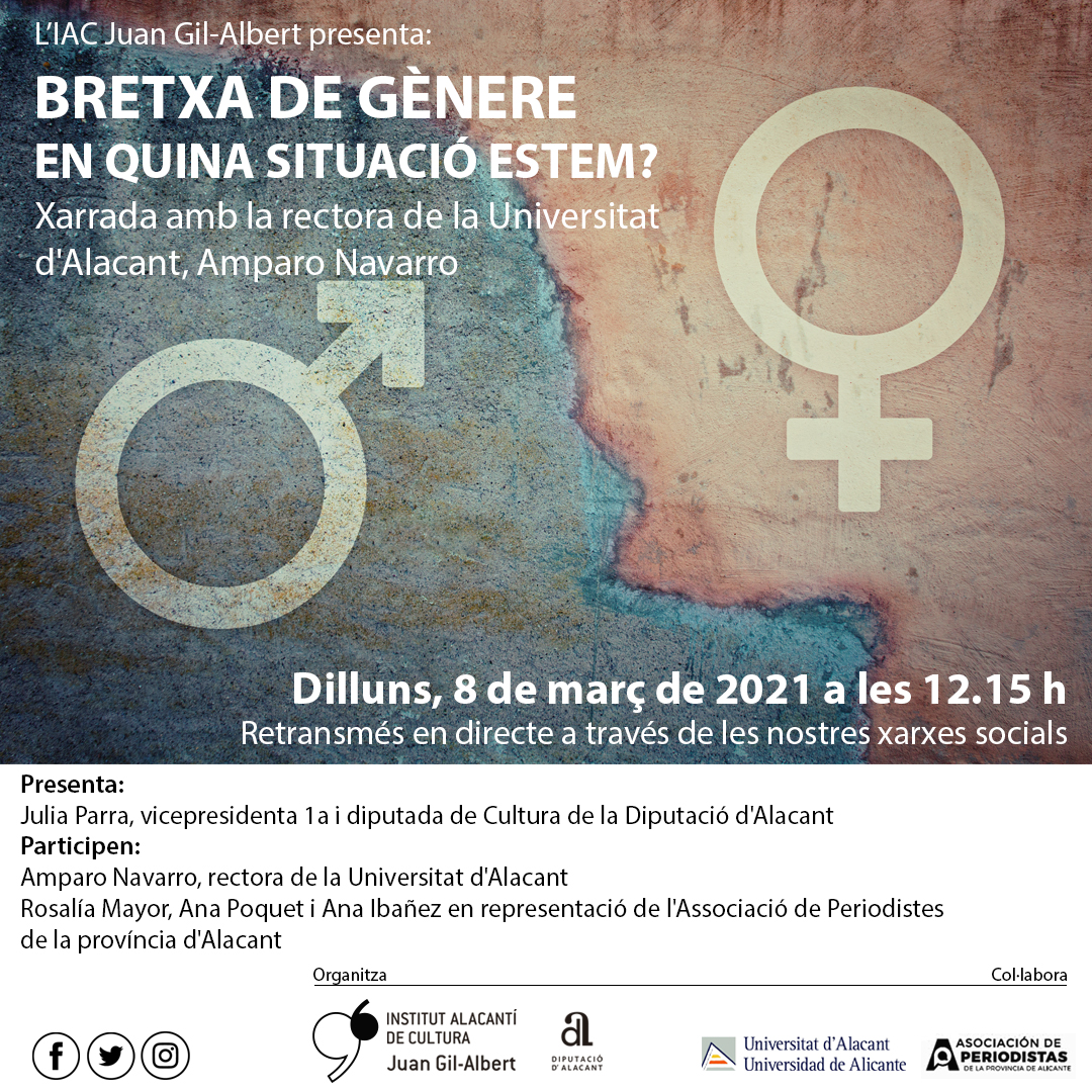 Entre els temes que es plantejaran en la xarrada, organitzada per l’Institut Juan Gil-Albert, figuren la bretxa de gènere i com aconseguir que desaparega amb la implicació de tots. L’acte es desenvoluparà amb format entrevista. Compta amb la col·laboració de la Associació de Periodistes de la Província d’Alacant. Intervindran la seua presidenta, Rosalía Mayor, la seua vicepresidenta, Ana Poquet, i la seua vocal, Ana Ibáñez.