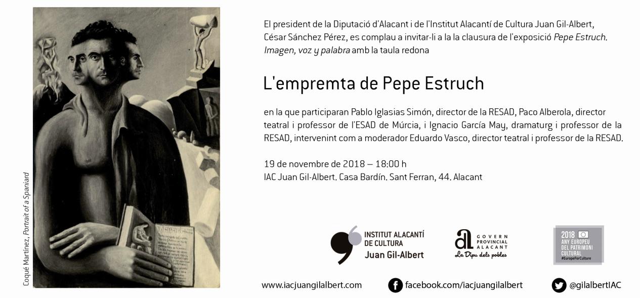 Amb aquest acte es tanca doncs l’exposició Pepe Estruch. Imagen, voz y palabra que ha presentat des del 2 d’octubre una mostra dels fons documentals donats l’any passat a l’IAC Juan Gil-Albert per Israel Chaves, custodie durant vint-i-set anys de l’arxiu personal del director teatral alacantí, seleccionada per les comissàries Juana María Balsalobre i Cristina Llorens. Fotografies, cartes, diaris, escenografies, adaptacions teatrals, programes de mà, llibres dedicats, enregistraments sonors i visuals, i fins i tot objectes com el Premi Nacional de Teatre concedit a Estruch en 1990, han pogut veure’s des de la seua inauguració el 2 d’octubre.