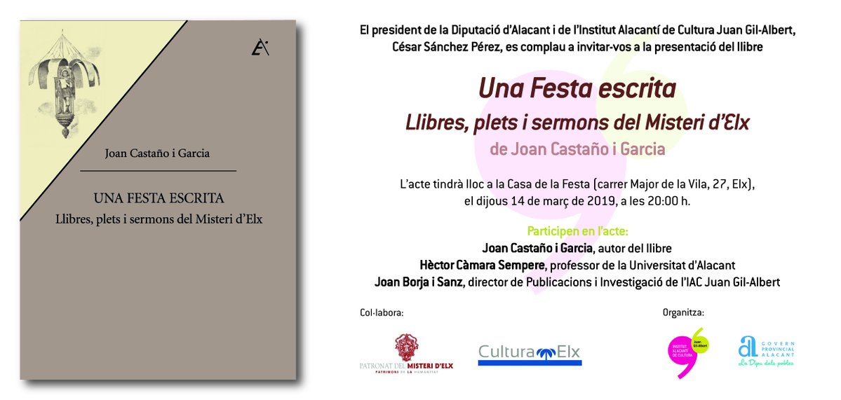 L’Institut Alacantí de Cultura Juan Gil-Albert presenta a Elx el llibre Una Festa escrita. Llibres, plets i sermons del Misteri d’Elx, de l’investigador Joan Castaño. L’acte tindrà lloc el dijous 14 de març a la Casa de la Festa a les 20.00 h, i en ell intervindran, al costat de l’autor, Hèctor Cámara, professor de la Universitat d’Alacant, i Joan Borja, director del departament de Publicacions i Investigació del Gil-Albert.