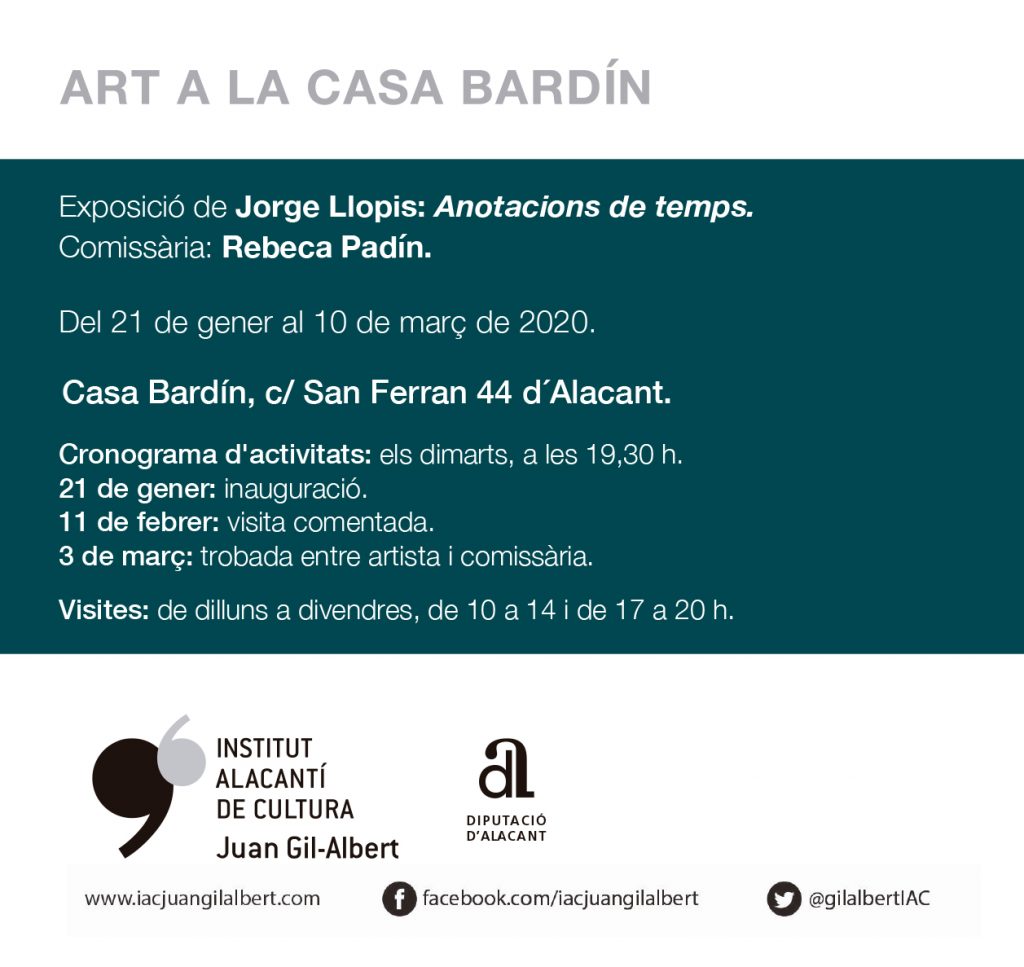 L’exposició de Jorge Llopis titulada Anotacions de temps és una mostra de l’obra que sorgeix de la investigacion al voltant de la pintura, el temps, la memòria i el record. És una proposta per a pensar-hi des de la pintura i qüestionar l’ambigüitat de la imatge.