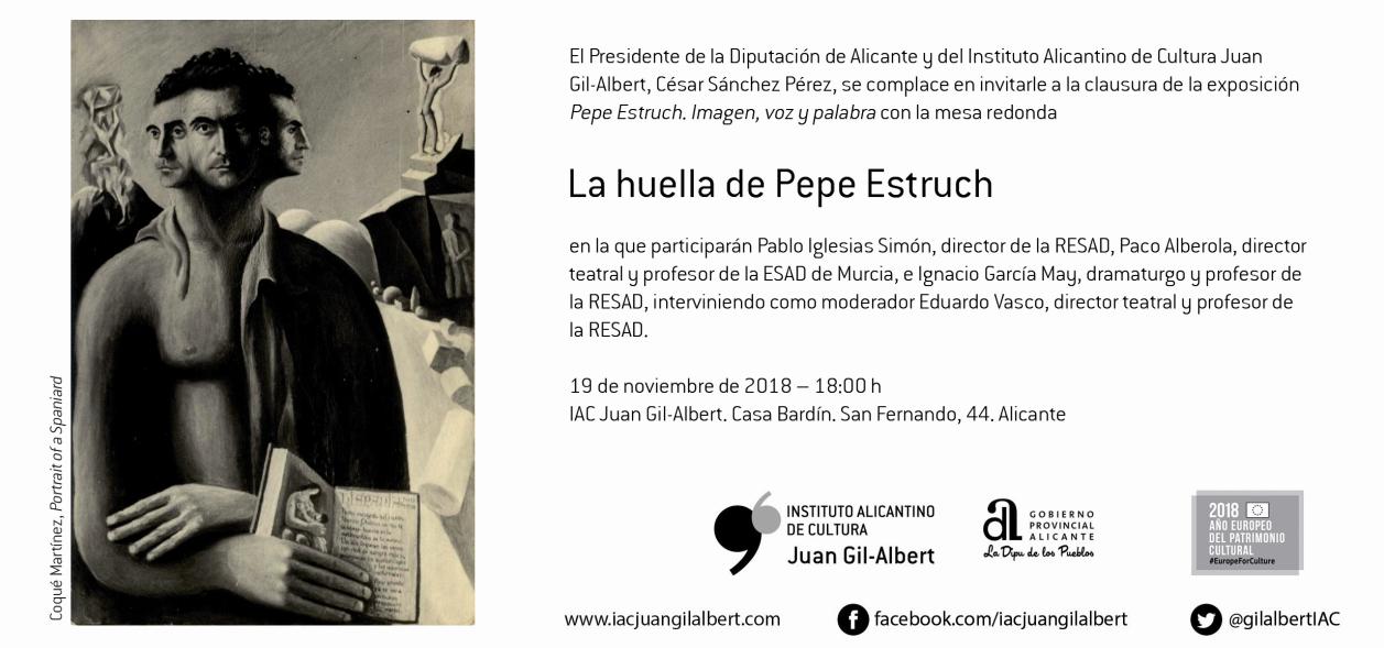Con este acto se cierra pues la exposición Pepe Estruch. Imagen, voz y palabra que ha presentado desde el 2 de octubre una muestra de los fondos documentales donados el año pasado al IAC Juan Gil-Albert por Israel Chaves, custodio durante veintisiete años del archivo personal del director teatral alicantino, seleccionada por las comisarias Juana María Balsalobre y Cristina Llorens. Fotografías, cartas, diarios, escenografías, adaptaciones teatrales, programas de mano, libros dedicados, grabaciones sonoras y visuales, e incluso objetos como el Premio Nacional de Teatro concedido a Estruch en 1990, han podido verse desde su inauguración el 2 de octubre.