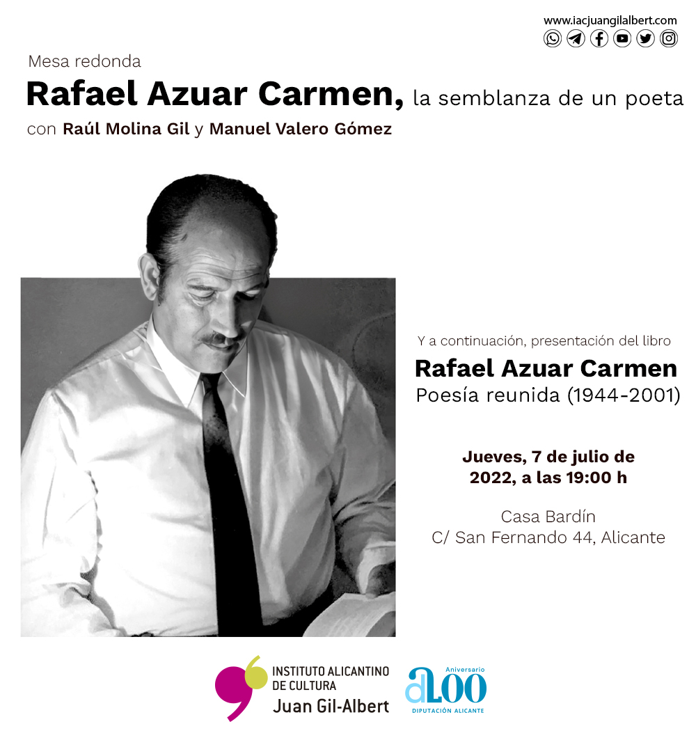 La velada abordará diferentes aspectos biográficos, de archivo e investigación para abordar la difusión y el estudio en torno al legado del poeta ilicitano, y a continuación, se presentará el libro Rafael Azuar Carmen. Poesía reunida 1944-2002, de Valero y Molina, recientemente publicado por el Instituto Gil-Albert