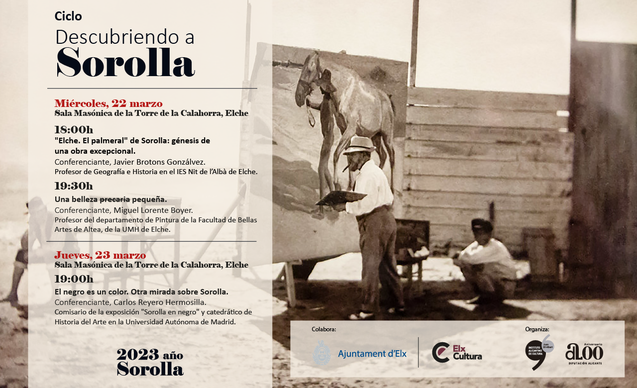 Así, con la colaboración del Ayuntamiento ilicitano, la Torre de la Calahorra acogerá mañana la inauguración de esta propuesta, a las 18:00 horas, de la mano de Javier Brotons, profesor de Geografía e Historia en el IES Nit de l´Albà de Elche, y la ponencia “Elche. El palmeral de Sorolla: génesis de una obra excepcional”; seguida por “Una belleza precaria pequeña”, que impartirá el profesor de Bellas Artes de Altea, Miguel Lorente, a las 19:30 horas.