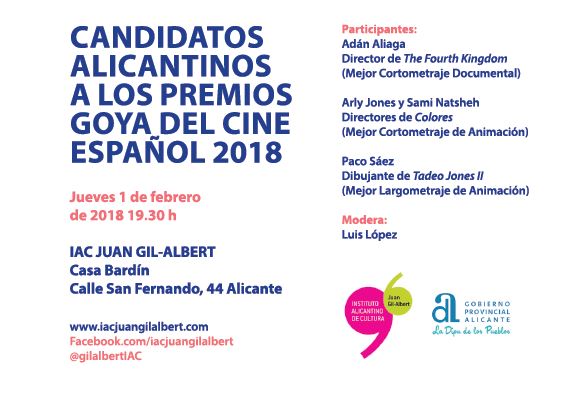 La Casa Bardín acogerá mañana el encuentro “Nominados alicantinos a los Premios Goya 2018” que contará con la presencia de Paco Sáez (por Tadeo Jones II, nominada a Mejor Largometraje de Animación), Adán Aliaga (por The Fourth Kingdom, nominada a Mejor Cortometraje Documental) y Arly Jones y Sami Natsheh (por Colores, Mejor Cortometraje de Animación).