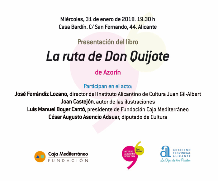 La presentación del libro, que ya publicó la Diputación de Alicante en 2005 con motivo del IV Centenario del Quijote y del centenario de esta obra del escritor de Monóvar, tendrá lugar mañana miércoles 31 de enero en la Casa Bardín a las 19:30 horas y contará con la asistencia del diputado de Cultura, César Augusto Asencio, y el presidente de la Fundación Caja Mediterráneo, Luis Boyer. El Gil-Albert ha realizado, en esta ocasión, una tirada reducida de 500 ejemplares.