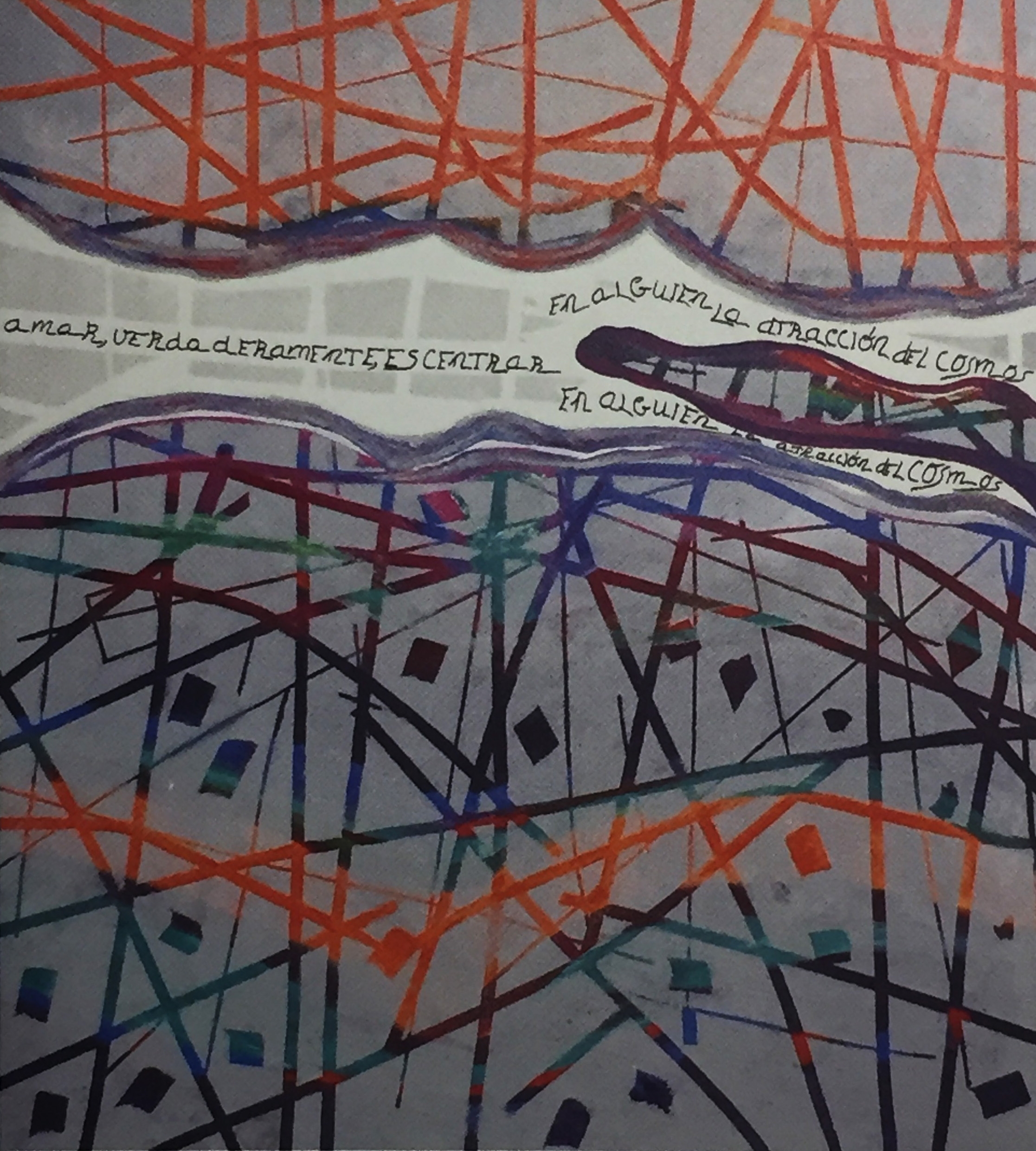 La obra formó parte de la exposición organizada por el IAC Juan Gil-Albert en 2004 con motivo del certamen “Miradas a Juan Gil Albert desde el arte y las artes en el Centenario de su nacimiento”, volviendo a cobrar actualidad ahora con el XXV aniversario de la muerte del escritor. La idea le surgió a la artista tras la lectura de una reflexión gilabertiana en el libro Breviarium vitae, donde el autor recogió aforismos y reflexiones anotados durante treinta años. En su caso le llamó la atención el pensamiento “Amar es verdaderamente centrar en alguien la atracción del Cosmos”, que incorporó a su pieza artística de técnica mixta.